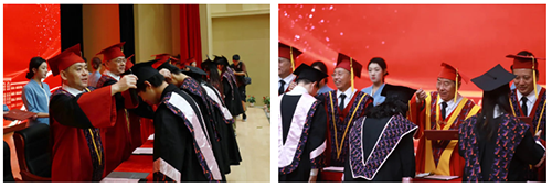 最激动人心的时刻到来,与会领导为毕业生代表颁发了毕业证书、学位证书,并举行拨穗仪式。